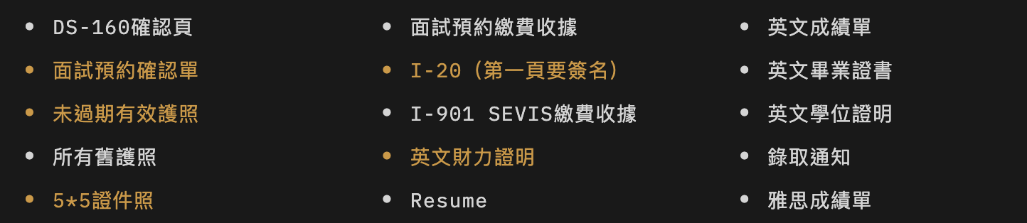 - 第三關也就是面試,把夾再一起的文件拿給工作人員後,過程中只詢問了我的資金來源,並要求我提供財力證明。確認完金額符合I-20上的推估金額後,就把文件還我通過了。